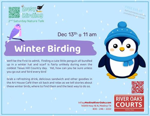 Come enjoy at The Art House Café for our next Nature Talk with Laura Levy, as we explore the beauty of winter birding in the Texas Hill Country! Discover which feathered friends call this home during the cooler months and get tips on spotting and identifying them. Enjoy a warm cup of coffee and a bite to eat while you listen!