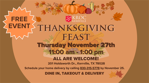 Join us at the Salvation Army Kerrville Kroc Center this Thanksgiving for a feast graciously provided by the Chuck Wagon Gang of Odessa. This is event is free to all.