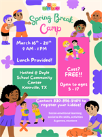 Free Spring Break Camp in Kerrville for ages 5-17. March 16-20, 9AM-1PM. Lunch provided. Hosted by K’STAR. Call 830-896-5404.